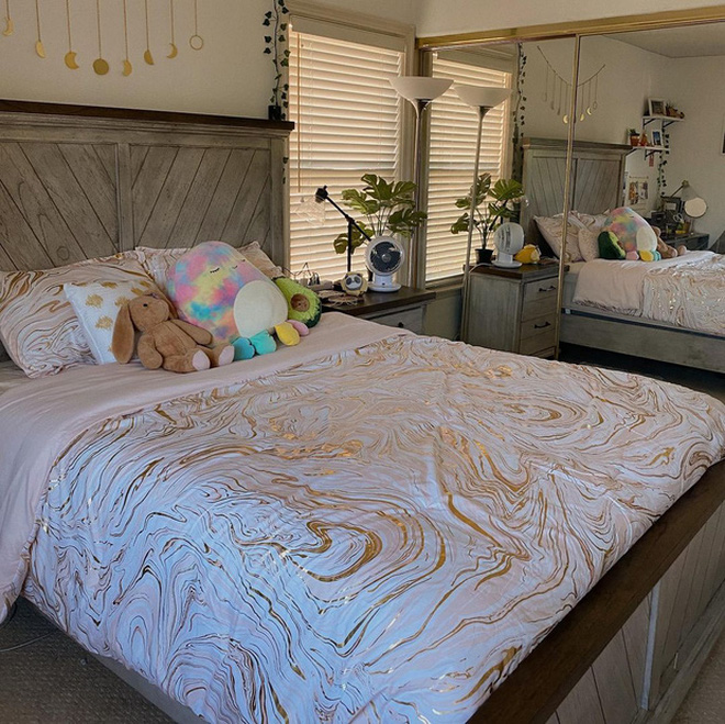 Trong video ấy, phòng ngủ của cô nàng nổi bần bật với tông màu chủ đạo là hồng - xám đi từ tường nhà cho đến nội thất, vừa mang nét nữ tính nhưng không kém phần sang trọng.