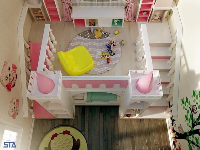 Về phần cô công chúa thứ 2 có cá tính mạnh và năng động - Yuki (5 tuổi), căn phòng của cô bé lại vô cùng lạ mắt với thiết kế mô phỏng hệt như một tòa lâu đài với tone hồng - trắng.