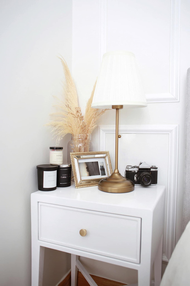 Gần giường ngủ, Thảo Nhi Lê cũng chọn cho mình một chiếc tủ đầu giường màu trắng khá basic. Bên trên, cô nàng trưng bày hoa khô và nến thơm để tăng thêm phần xinh xắn.