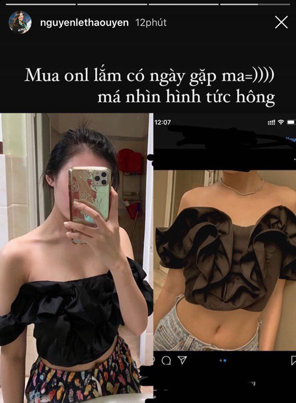 Cụ thể, Thảo Uyên đăng lên hình ảnh quảng cáo và thực tế của một chiếc áo croptop. Ở ảnh mẫu shop đăng, có thể thấy áo croptop này có thiết kế rất đặc biệt nhưng không kém phần điệu đà với phần bèo nhún dựng đứng ở phần cúp ngực.