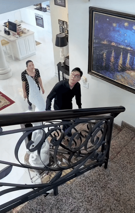 Phía dưới tầng 1 là khu vực bếp, bàn ăn cũng như phòng khách của gia đình. Hạnh Sino cũng ưu tiên lựa chọn thiết kế theo phong cách tân cổ điển, đồ nội thất với màu sắc sang trọng. Bên cạnh đó, từng chi tiết decor như đèn chùm, khung tranh,... cũng được Hạnh Sino chọn mẫu tỉ mỉ, sắp xếp trong căn nhà thêm phần lung linh, ấm cúng.