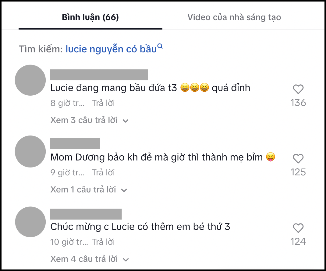 “Chúc mừng chị Lucie có thêm em bé thứ 3”, “Chuyến này mom Dương tàn canh”, “Gen nhà này đỉnh, đẻ tiếp đi chị ơi”, “Chị ơi, chị có em bé nữa hả”, “Chúc mừng mom Dương nha”, “Chuyến này mom Dương phải mọc 3 đầu 6 tay mới lo nổi”, “Lucie đang mang bầu đứa thứ 3 rồi. Quá đỉnh!”,... là một số bình luận từ netizen.