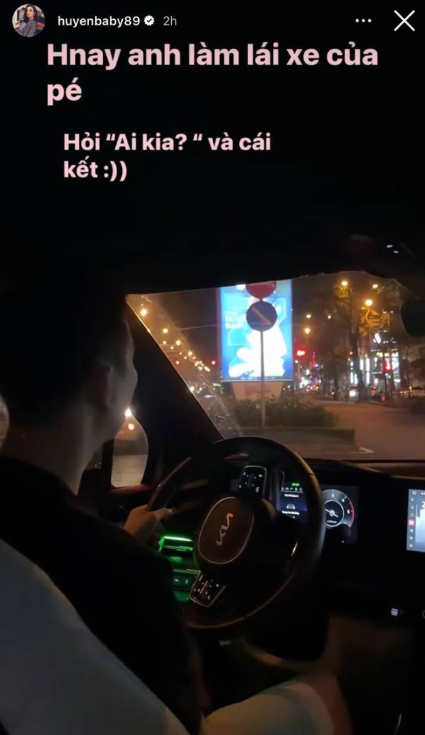 Mới đây khi cập nhật lịch trình bận rộn sau khi tham gia show thực tế, Huyền Baby đăng tải hình ảnh được chồng đưa đón sau giờ làm bằng xế hộp. Chị đẹp còn vui vẻ viết rằng "hôm nay anh chồng làm tài xế". Trên xe, Huyền Baby không ngừng hát ca khúc Hai Phút Hơn từng biểu diễn ở sân khấu đánh dấu sự trở lại sau 10 năm vắng bóng showbiz. Nhưng nhận về cái kết là "ai kia" làm lơ luôn, chồng đại gia reaction một cách rất "lặng im". Tuy vậy, tâm trạng chị đẹp vẫn vui như thường vì biết tính chồng ít nói.