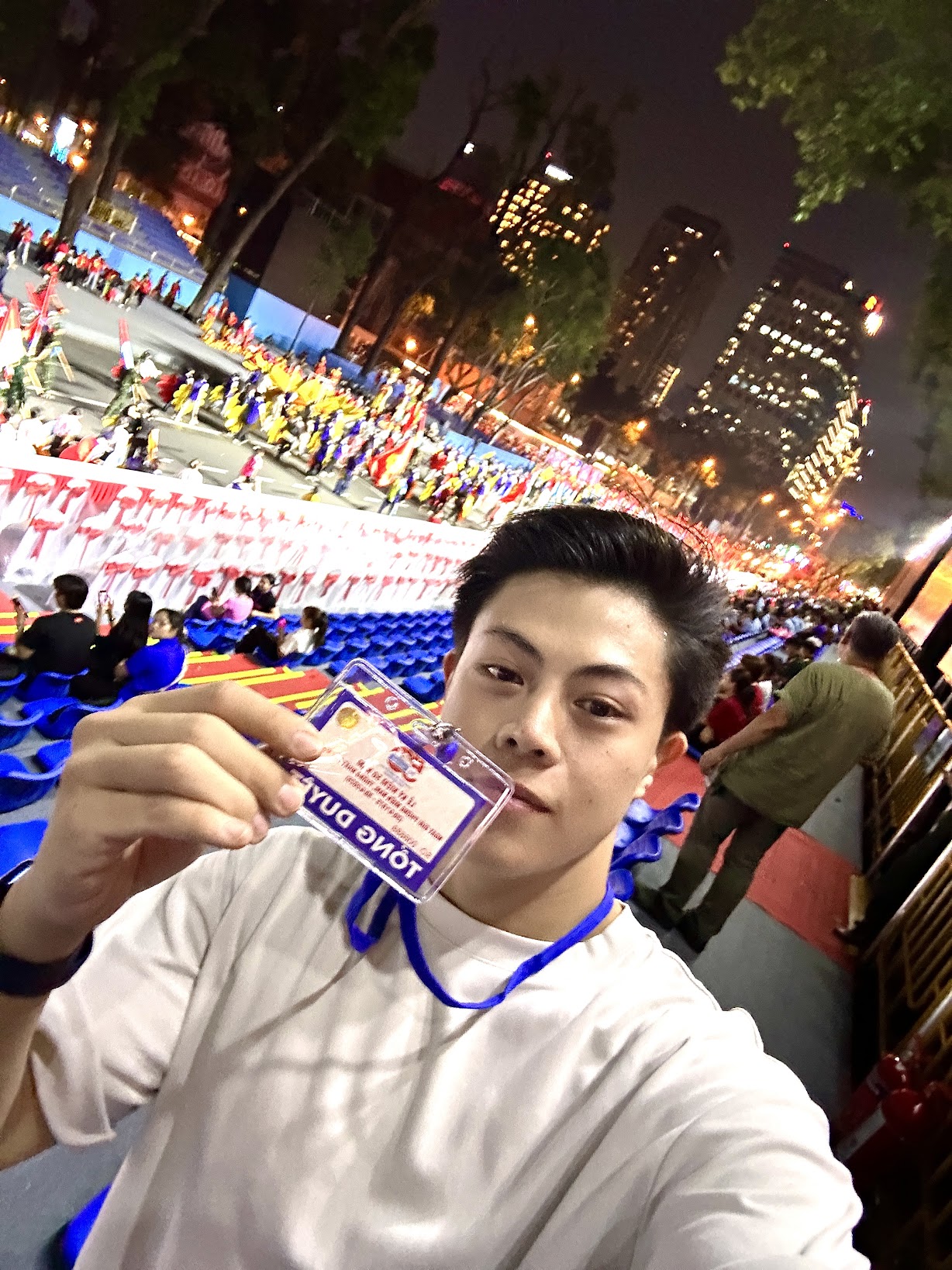 Vào ngày tổng duyệt thứ 2, bọn mình được lệnh tập kết sớm hơn dự kiến. Tưởng đâu sẽ phải tập luyện nhiều hơn nhưng rốt cuộc hôm đó bọn mình lại được lên khán đài ngồi xem các khối văn nghệ biễu diễn trước khi luyện tập.