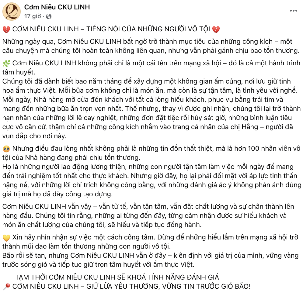 Mới đây, tài khoản Facebook chính thức của nhà hàng Cơm Niêu CKU LINH - thương hiệu từng gắn liền với Quang Linh VLogs đã đăng bài lên tiếng về tình hình hiện tại của mình. Theo chia sẻ của thương hiệu này, họ trở thành mục tiêu bị công kích, “phải gánh chịu bao tổn thương” từ một câu chuyện mà họ không liên quan.