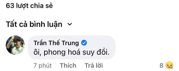 Dưới bài đăng, Quán quân Olympia năm thứ 19 Trần Thế Trung cũng đã để lại bình luận thể hiện thái độ của bản thân về sự việc xoay quanh nhân vật Nguyễn Việt Thái. Anh chàng này bình luận cụm từ "Phong hóa suy đồi", ngụ ý chỉ sự xuống cấp của văn hóa, đạo đức.