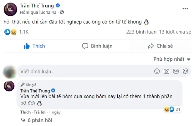 Mới đây, không hiểu có ai đã "động chạm" đến nam sinh mà khiến 10x phải đăng bài viết dằn mặt trên trang cá nhân: "Vừa mới lên bài hôm qua xong hôm nay lại có thêm 1 thành phần 'bố đời'".