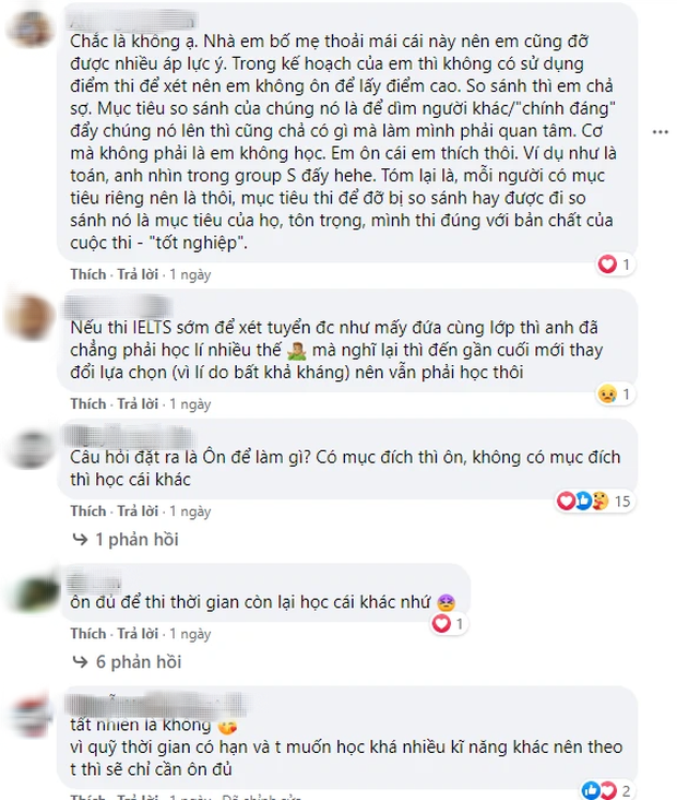 - "Mình cũng nằm trong phạm vi của bài post này. Giờ mình chỉ cắm đầu học tiếng Anh vì vừa là thứ cần, vừa là cái mình đang kém nhất. Mình cũng vừa đổi từ khối Khoa học Tự nhiên sang Khoa học Xã hội vì thấy xét tốt nghiệp sẽ dễ có điểm cao hơn. Chuẩn bị cho tương lai vẫn quan trọng hơn là để ý thiên hạ nghĩ gì về các con số của mình".