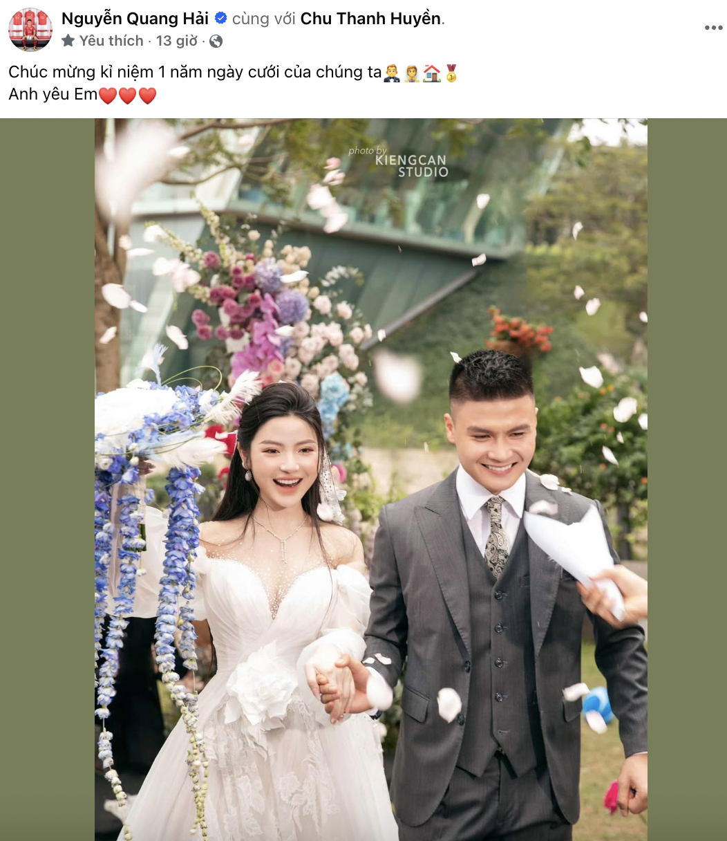 Đêm 28/3, tiền vệ Nguyễn Quang Hải gây xôn xao khi có bài đăng kỉ niệm 1 năm ngày cưới của anh và Chu Thanh Huyền. Cầu thủ sinh năm 1997 không nhiều lời mà chỉ bằng ba chữ "Anh yêu em" đã thể hiện tình yêu bền vững, không hề suy chuyển dành cho bà xã xinh đẹp bất chấp việc Chu Thanh Huyền đang dính loạt lùm xùm trên mạng xã hội, liên tục bị "đào bới" đời tư trong quá khứ.