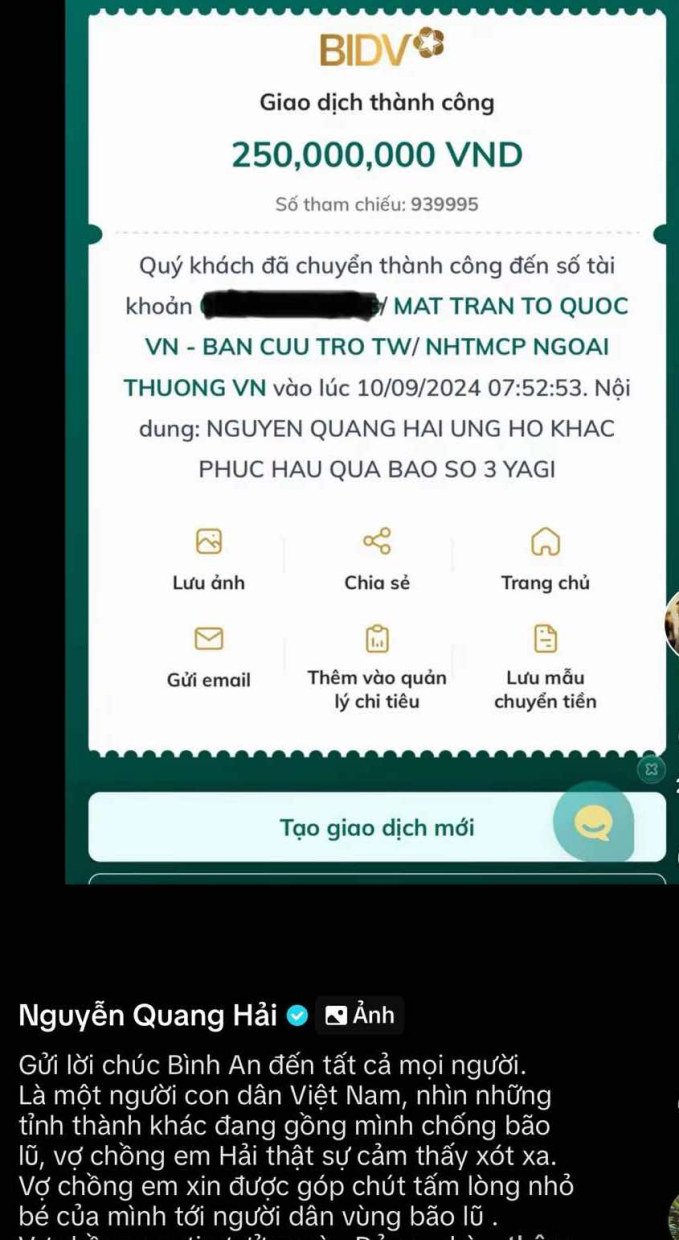 "Gửi lời chúc bình an đến tất cả mọi người. Là một công dân Việt Nam, nhìn những tỉnh thành khác đang gồng mình chống bão lũ, vợ chồng Hải thật sự thấy xót xa. Vợ chồng em Hải xin được gửi chút tấm lòng nhỏ đến người dân vùng bão lũ", Quang Hải chia sẻ.