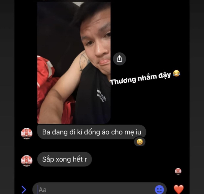 Câu trả lời của tiền vệ sinh năm 1997 còn khiến chính Thanh Huyền bất ngờ. Cô nàng còn khoe đoạn trò chuyện với chồng. Quang Hải chia sẻ đang mang áo đi xin chữ ký để đưa cho vợ.