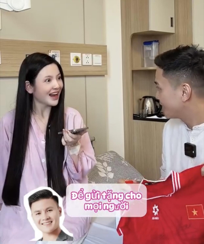Theo đó, Chu Thanh Huyền đã khoe đoạn video gọi điện cho chồng cầu thủ. Cô nàng hỏi xin chồng áo đội tuyển Việt Nam có chữ ký của anh và các đồng đội để làm quà tặng cho cư dân mạng. Khi nhận được lời đề nghị của vợ bầu, Quang Hải nhẹ nhàng đồng ý, anh tiết lộ sẽ tặng 10 chiếc áo mẫu mới của đội tuyển Việt Nam.