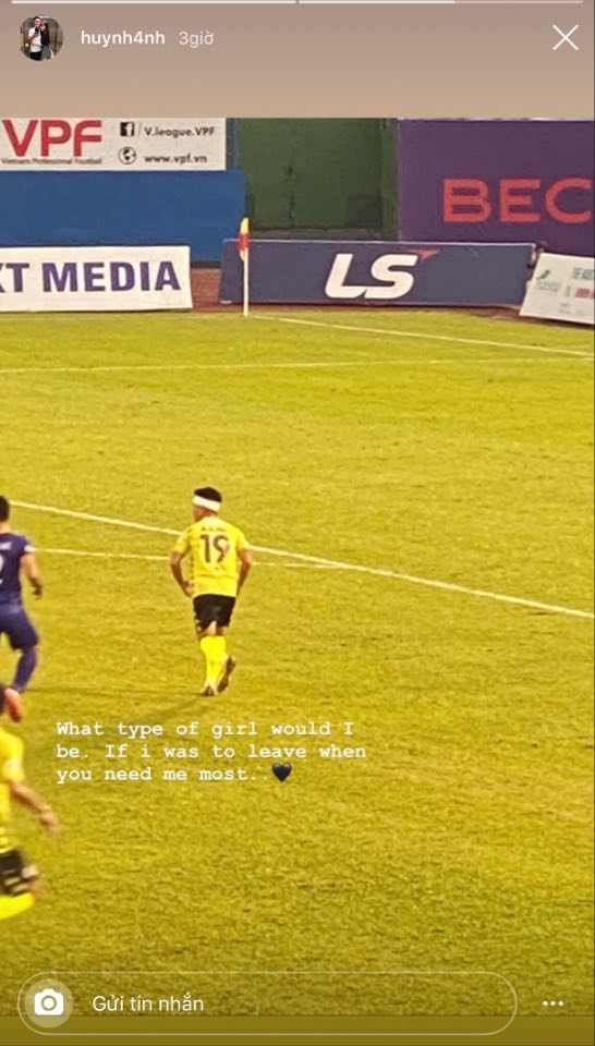Không chỉ có vậy, trong lúc xem trận đấu, Huỳnh Anh còn đăng story đầy tâm trạng: "What type of girl would I be, if I was to leave when you need me most" (Tạm dịch: Em sẽ là một cô gái như thế nào nếu em rời đi lúc anh cần em nhất) để thể hiện sự ủng hộ của mình với người yêu.