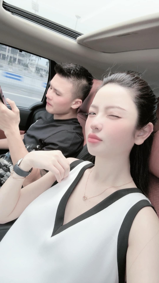 Sáng 14/5, nàng WAG Chu Thanh Huyền vui vẻ chia sẻ hình ảnh khi được chồng là tiền vệ Nguyễn Quang Hải đưa đi ăn sáng. Trên xế hộp sang trọng, Chu Thanh Huyền thoải mái chụp ảnh selfie cùng ông xã, nhưng trái ngược với tâm trạng của vợ, Quang Hải lại mang biểu cảm hơi căng thẳng. Anh chàng chăm chú vào điện thoại, không tương tác cùng nàng khi chụp hình. Nàng WAG cảm thán: "Đưa vợ con đi ăn sáng mà mặt hơi căng thẳng các chị ạ".