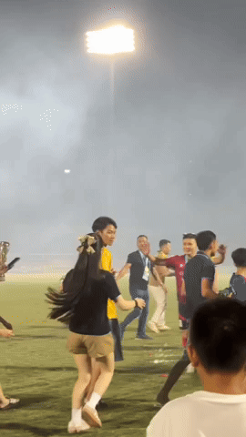 Sau khi ban tổ chức tiến hành trong cúp và huy chương nàng WAG Chu Thanh Huyền đã được Quang Hải đón xuống sân để ăn mừng. Trong video được cô nàng sinh năm 2000 chia sẻ, Quang Hải đã chạy về phía vợ ông cô vào lòng, chàng tiền vệ cũng không ngần ngại dành nụ hôn cho vợ. Đặc biệt, dân tình còn chứng kiến khoảnh khắc cặp đôi nắm tay nhau chạy về phía cổ động viên của CLB CAHN để ăn mừng. Quang Hải tay trong tay với vợ mãi không rời.