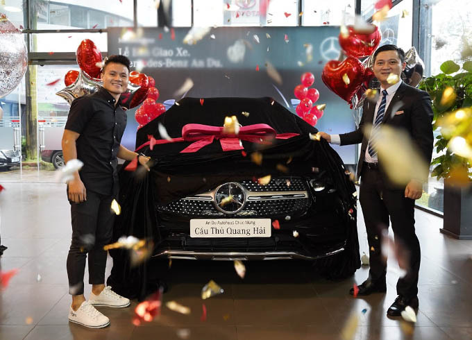 Sáng 17/3, một đại lý xe hơi tại Hà Nội đăng tải loạt ảnh Quang Hải dự lễ bàn giao xe mới. Xế hộp được tiền vệ 22 tuổi chọn mua là chiếc Mercedes-Benz GLC 300 có giá khoảng 2,4 tỷ đồng. Bố mẹ Quang Hải cũng có mặt để chúc mừng con trai.