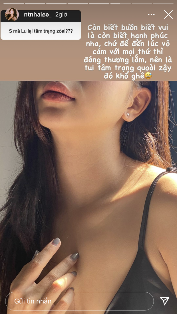Trước đó, cô nàng cũng mở Q&A, trò chuyện với dân mạng và giải thích tại sao lại hay tâm trạng: "Còn biết buồn biết vui là còn biết hạnh phúc nha. Chứ để đến lúc vô cảm với mọi thứ thì đáng thương lắm, nên là tui tâm trạng hoài vậy đó. Khổ ghê!".