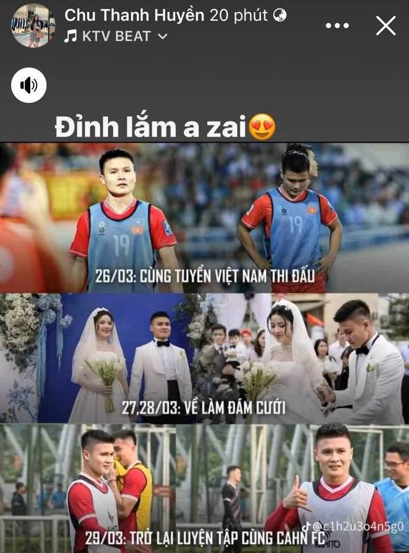 Vừa làm đám cưới xong đã vội xa nhà đi thi đấu, Quang Hải không những không bị vợ giận mà Chu Thanh Huyền còn động viên anh bằng lời cổ vũ "đỉnh lắm anh zai (anh trai - PV)". Trước khi lên đường, Hải "con" còn không quên hôn tạm biệt vợ, lần đầu công khai tình tứ với nàng trên livestream hàng ngàn người xem.