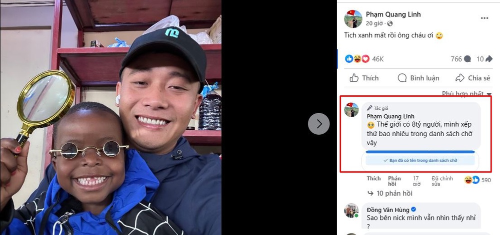 Có thể thấy, ngay cạnh tên "Phạm Quang Linh" quen thuộc, không còn dấu hiệu đặc trưng của tích xanh nữa. Anh chàng có vẻ khá hụt hẫng và tiết lộ thêm mình đã gửi kháng nghị đến Facebook. Có lẽ trong thời gian tới, Quang Linh sẽ có tích xanh trở lại, sau khi Facebook kiểm tra lại hoạt động của trang cá nhân.