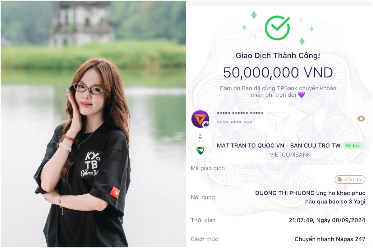 Sau khi cơn bão số 3 (bão Yagi) càn quét, nhiều tỉnh, thành bị ảnh hưởng nặng nề, gây mưa lũ, sạt lở đất, sập cầu,... Với tinh thần tương thân tương ái, một miếng khi đói bằng một gói khi đó, rất nhiều người nổi tiếng đã chủ động đóng góp, ủng hộ tiền về nguồn quỹ của Ban Cứu trợ Trung ương - Ủy ban Trung ương Mặt trận Tổ quốc Việt Nam.