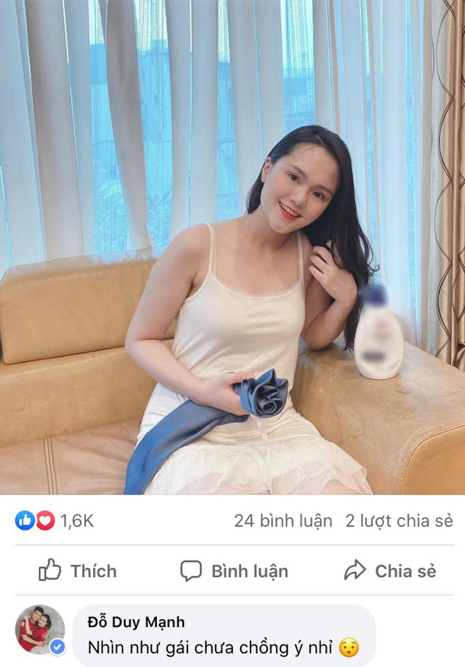 Thế nhưng, thay vì khen vợ, Duy Mạnh lại đáp một câu: "Nhìn như gái chưa chồng ý nhỉ". Nhiều người cho rằng Duy Mạnh vừa khen vừa tỏ ra ghen tỵ với vẻ đẹp của vợ. Và do đó, lời khen của Duy Mạnh theo kiểu "nói mát" thì đúng hơn.
