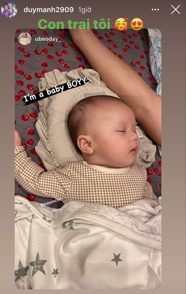 Trên trang cá nhân của mình, Duy Mạnh cũng đăng tải ảnh bé Ú đang ngủ say trên giường và những icon thể hiện niềm hạnh phúc.