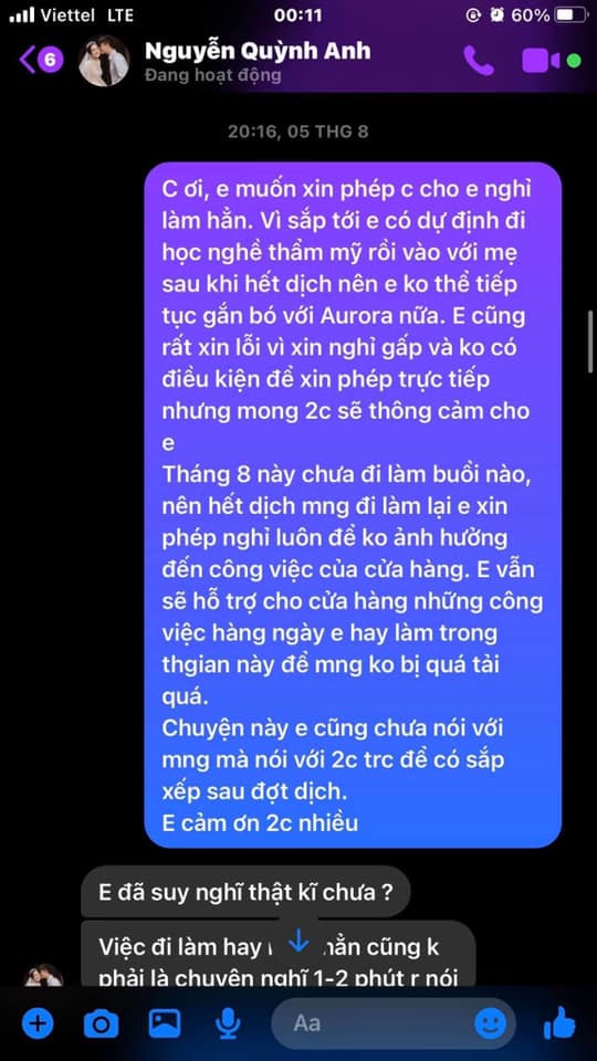 Ngoài ra, nhân viên này còn tiết lộ công việc của cửa hàng "mập mờ", thiếu chuyên nghiệp và khi nhân viên xin nghỉ việc thì không giải quyết lương thỏa đáng: "Mình đã nói sẽ chịu trách nhiệm bàn giao lại công việc chính cho các bạn nhân viên mới, cũng hỗ trợ shop đến hết tháng 8 và chỉ xin được nhận lương tháng 7 (vì mình cũng chỉ hỗ trợ công việc "lặt vặt lẻ tẻ" như chị Mi nói). Nhưng chị Quỳnh Anh có từ chối và chỉ đồng ý trả lương cứng cho mình là 5 triệu (không tính doanh thu + thưởng như mọi tháng)".