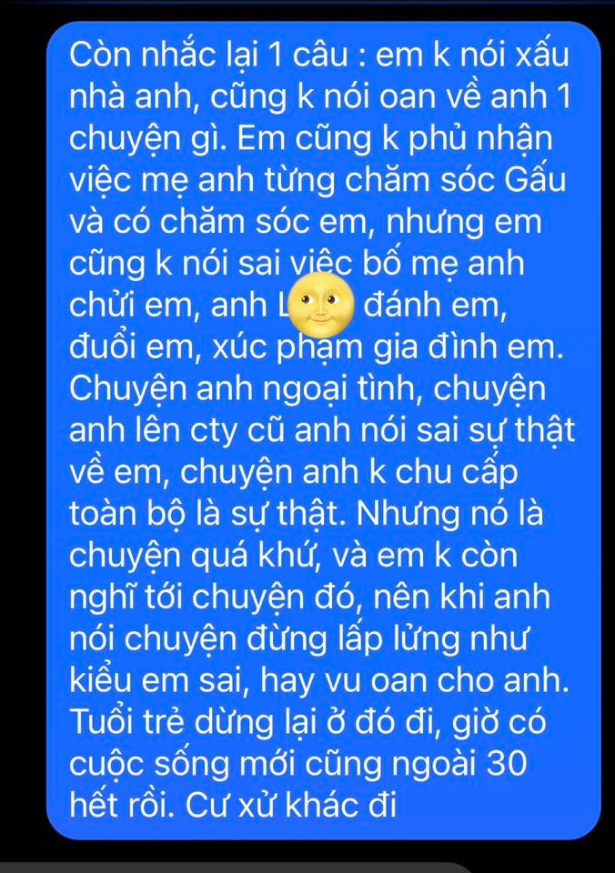 Không chỉ dừng lại ở vấn đề chu cấp, Quỳnh Lương còn nhắc lại những chi tiết trong cuộc hôn nhân cũ. Cô không phủ nhận việc mẹ chồng cũ từng chăm sóc mình và Gấu, nhưng đồng thời khẳng định gia đình chồng cũ cũng không đối xử tốt với cô. Đặc biệt, Quỳnh Lương một lần nữa nhấn mạnh chuyện chồng cũ ngoại tình và thêu dệt thông tin không đúng về cô: “Up cái chuyện từ gần 10 năm trước nó xấu hổ cả mẹ lẫn con nhưng mà anh H. nói điêu nhiều quá nên mệt. Anh bớt thêu dệt giùm”.
