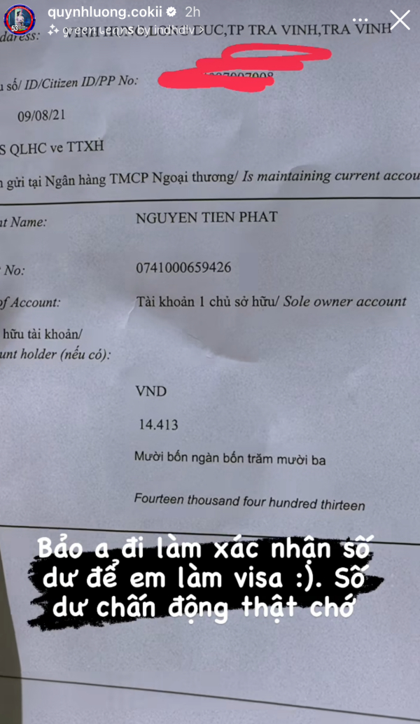 Cụ thể, khi Quỳnh Lương bảo Tiến Phát đi làm xác nhận số dư để cô xin visa thì phát hiện số dư của của Tiến Phát là: 14.413 đồng (Mười bốn ngàn bốn trăm người ba đồng). Vâng! Chính xác không thừa không thiếu một con số nào.