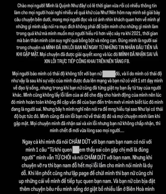 Hồi tháng 9/2023, Quỳnh Như vướng ồn ào từng là người thứ 3 trong quá khứ. Cụ thể, vào năm 2021, Như bị tố xen vào chuyện tình cảm của bạn trai cũ dù biết người này đang hạnh phúc bên tình mới. Khi người mới liên lạc để nói chuyện rõ ràng thì Quỳnh Như có thái độ không thiện chí, thách thức cô gái này “bóc phốt” mình.