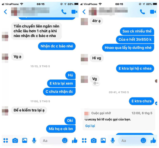 Mình không nghi ngờ gì, cho đến khi mãi không nhận được tiền mới hỏi lại thì em ấy bắt đầu nói lòng vòng. Mình đợi một tuần vẫn không có, sau đó bị chặn luôn Facebook và số điện thoại, mới biết bị lừa".