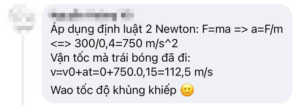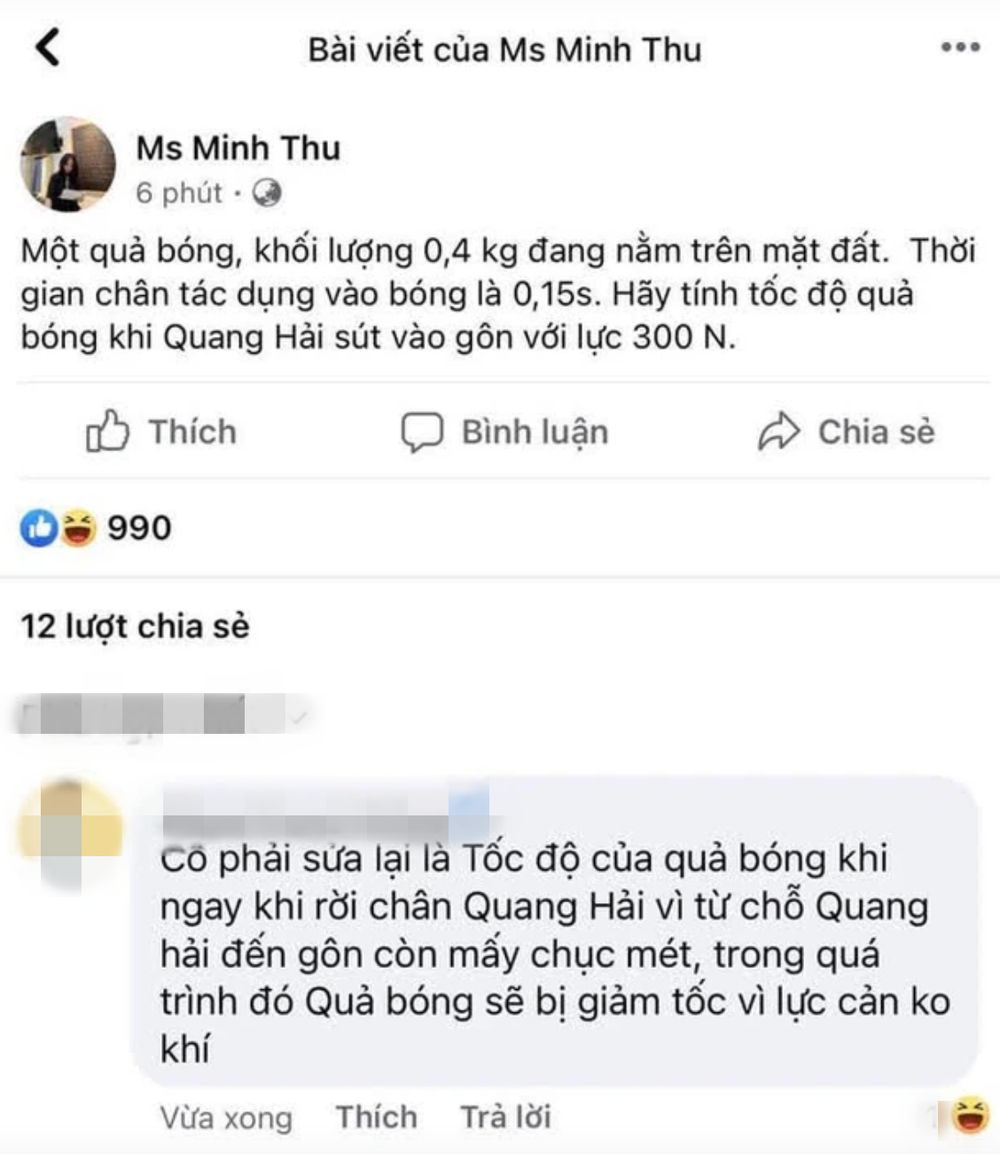 Không đứng ngoài cuộc vui, "cô giáo" Minh Thu cũng đã đưa ra một đề bài Vật lý vui liên theo cú sút siêu phẩm giúp Việt Nam dẫn trước tỉ số của Quang Hải: "Một quả bóng có khối lượng 0,4kg đang nằm trên mặt đất. Thời gian chân tác dụng vào bóng là 0.15s. Hãy tính tốc độ quả bóng khi Quang Hải sút vào hôn với lực 300N".