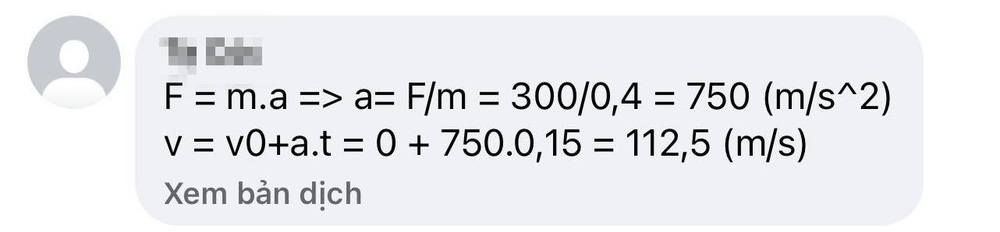 Tuy đề bài có chút thiếu sót nhưng nhiều "học sinh" của hotgirl Vật lý đã nhanh chóng đưa ra lời giải. Theo cách tính của phần lớn khán giả có đáp án thì câu hỏi này cần sử dụng Định luật II Newton và kết quả cuối cùng là 112,5 m/s.