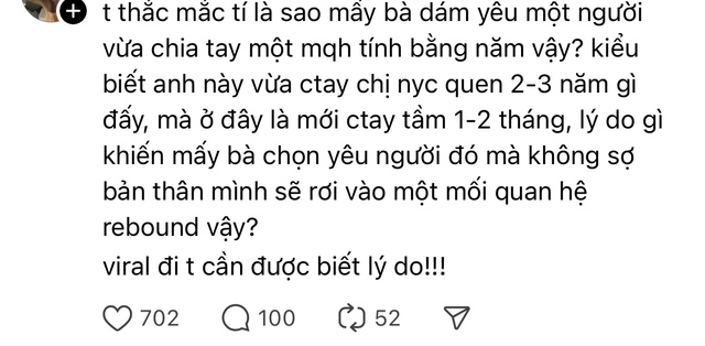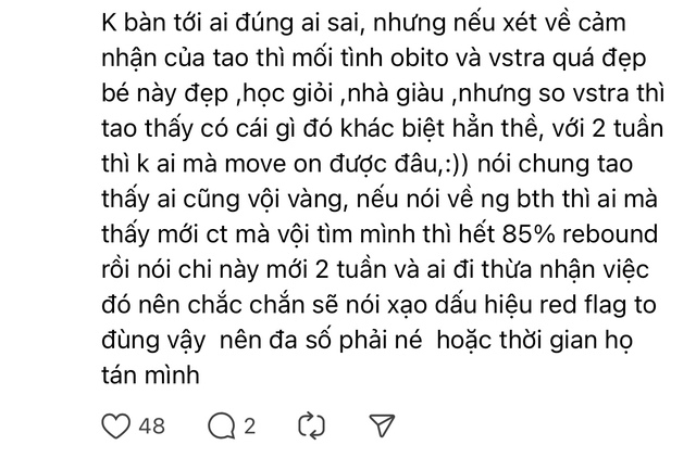 Trên thực tế, đây vẫn luôn là vấn đề gây ra nhiều tranh cãi. Đó cũng là lý do vì sao mà bài đăng "tố" rapper Obito hẹn hò người mới chỉ sau vài tuần chia tay VSTRA nhanh chóng viral như vậy. Một phần vì tên tuổi của chàng rapper này khá đình đám, một phần là bởi cộng đồng mạng bàn tán rôm rả xem Obito có phải đang "rebound" hay không.