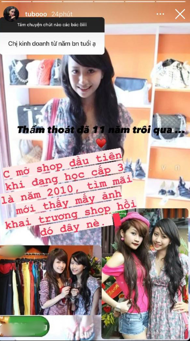 Thế nhưng, spotlight của màn Q&A này không nằm ở độ tuổi khởi nghiệp mà lại ở trong những bức ảnh khai trương cửa hàng của Thanh Tú. Có thể thấy dù chụp chung với hot girl đình đám thời đó như Chi Pu hay Vân Navy, Tú Boo vẫn không hề lép vế về mặt nhan sắc. Rich kid sở hữu làn da trắng sáng, gương mặt với các đường nét sắc sảo trông xinh xắn và rạng rỡ ở tuổi 17.