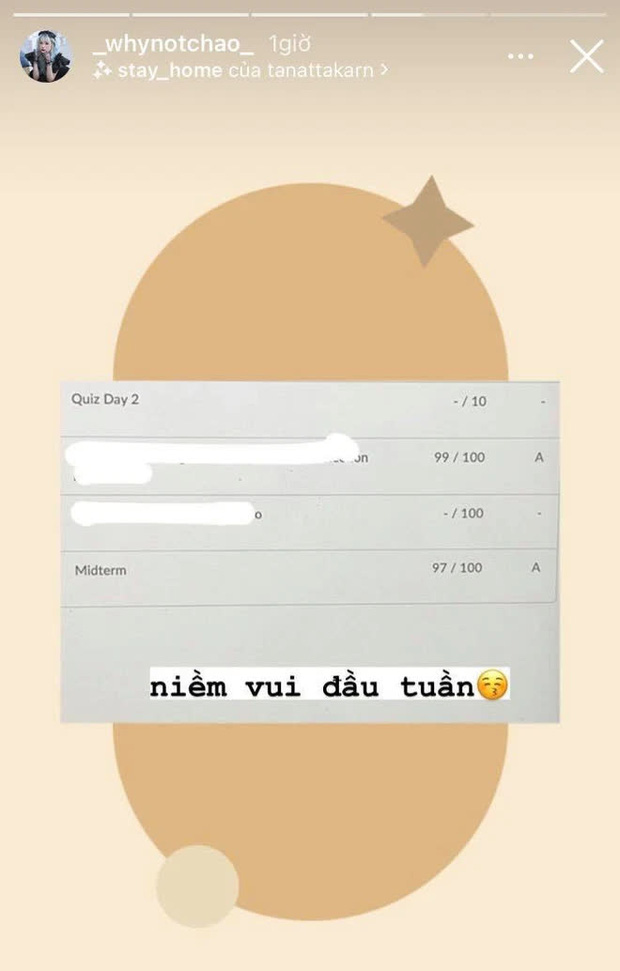 Trên trang cá nhân, rich kid Châu Anh vừa khoe thành tích học tập trong những tháng đầu làm sinh viên của mình. Những điểm số mà cô nàng đạt được khiến netizen không khỏi xuýt xoa. Trong 2 bài kiểm tra đã có điểm, Chao có một bài đạt 99/100 điểm, còn điểm giữa kỳ cô nàng cũng đạt tới 97/100 điểm. 2 điểm số này đều được xếp loại A.