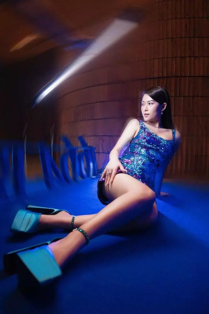 Cụ thể, cô diện chiếc đầm xanh tone sur tone nhìn rất rực rỡ. Theo đó, bạn thân Primmy Trương để lộ đôi chân kém thon và làn da không đều màu.