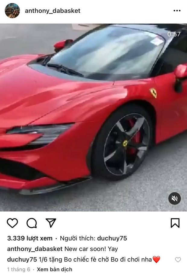 Chưa hết, trong một bài đăng có xuất hiện một chiếc Ferrari của cậu ấm, Đức Huy cũng "nhẹ nhàng" hỏi han: "1/6 tặng Bo chiếc ‘fè’ chở Bo đi chơi nha" khiến nhiều người không khỏi ganh tị với Anthony. Bởi lẽ, tính sương sương, 2 chiếc siêu xe cũng tốn tầm đâu 70 tỷ thôi à!