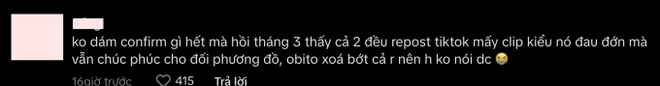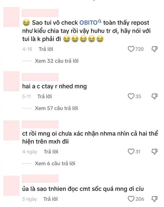 Dẫu vậy, đây mới chỉ là hint và tin đồn do cộng đồng mạng bình luận, cả Obito và VSTRA đều chưa ai lên tiếng chính thức. Cặp đôi cũng vẫn follow nhau trên Instagram. Tuy nhiên, tin đồn này khiến không ít fan couple thể hiện sự lo lắng, hoang mang, thậm chí tuyên bố thất tình online nếu Obito và VSTRA thật sự đã “đường ai nấy đi”.