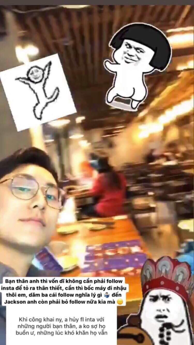 Về hành động unfollow hết bạn bè để chỉ follow 1 mình bạn gái, Rocker cho biết: "Bạn thân anh thì vốn dĩ không cần phải follow để tỏ ra thân thiết, cần thì bốc máy đi nhậu thôi em, dăm ba cái follow nghĩa lý gì."