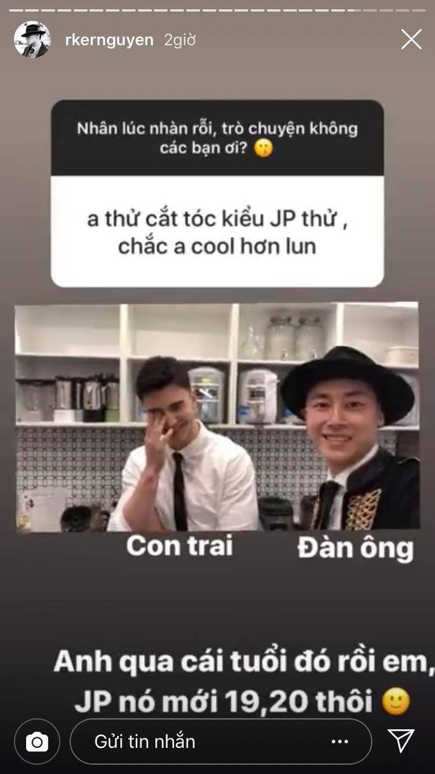 Bên cạnh đó, anh chàng không quên "cà khịa" nhẹ Justin Bieber. Khi được fan gợi ý cắt kiểu tóc giống JB, Rocker Nguyễn đã trả lời rằng mình qua cái tuổi đó rồi vì JB chỉ mới... 19,20 tuổi dù thật ra, 2 người này đều sinh năm 1994.