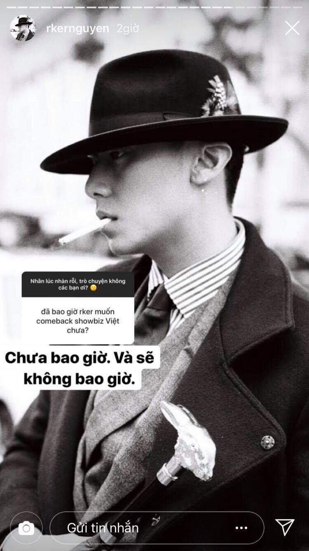 Mới đây, anh chàng này đã mở phần trả lời câu hỏi trên Instagram và giải đáp nhiều thắc mắc của dân mạng. Sau những lùm xùm và ồn ào trong quá khứ, Rocker khẳng định mình: "chưa bao giờ và sẽ không bao giờ" quay lại showbiz.