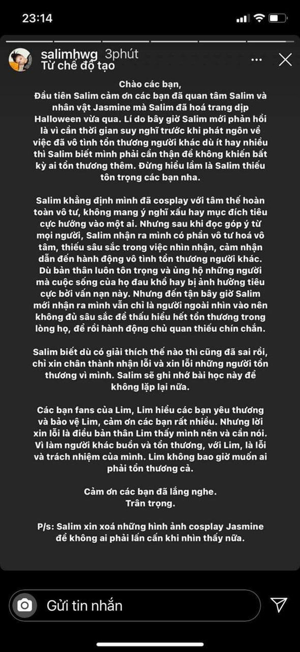 Salim đã quyết định đưa ra phản hồi về sự việc này khi nhận ra câu chuyện đã đi quá xa. Cô lên tiếng trên story Instagram. Salim cũng xin phép xóa hết những hình ảnh cosplay Jasmine gây tranh cãi đó của cô.