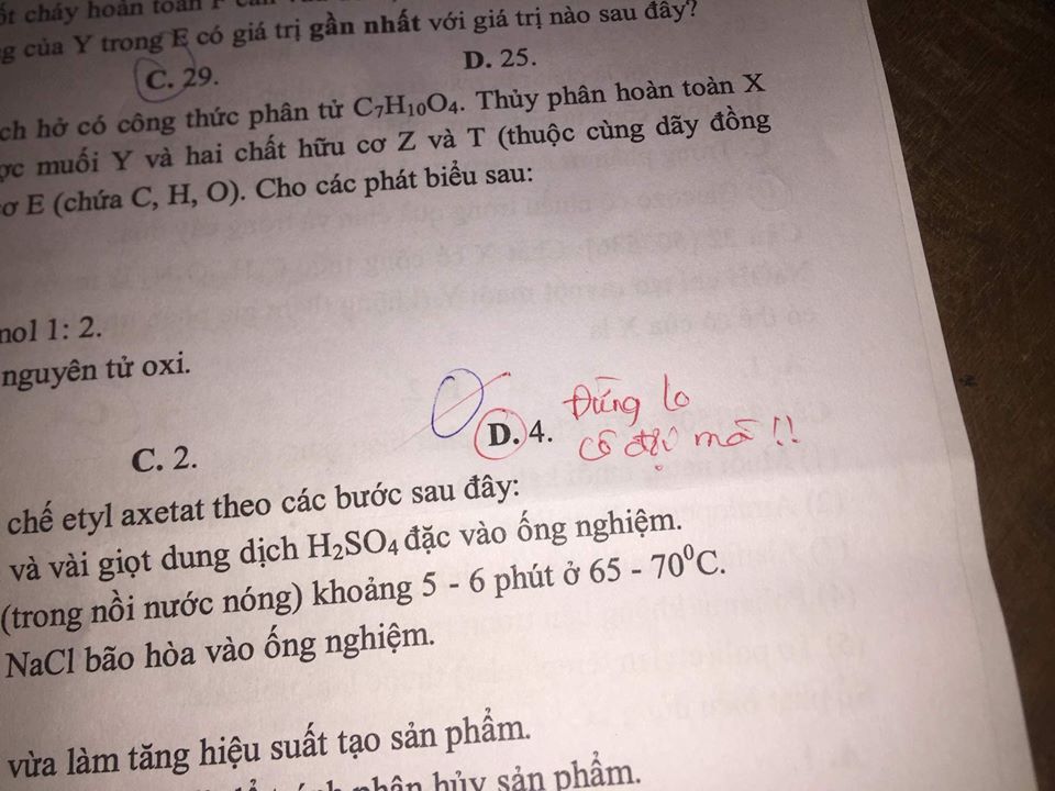 Theo đó, trong một câu hỏi trắc nghiệm Hóa học, đáp án đáng ra phải khoanh là D. Tuy nhiên, có thể vì quá vội vàng nên cậu chàng vội vàng mà trượt ra ngoài. Khi chấm điểm, cô giáo đã viết 1 dòng nhắn nhủ vừa ngọt ngào mà vừa hài hước: "Đừng lo cô đợi mà!"