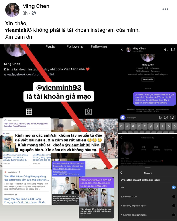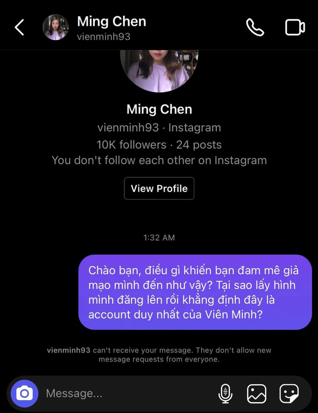 Cũng trong bài đăng của mình, Viên Minh cho biết thêm thời gian gần đây cô hơi "hết hồn" khi thấy "bản thân" phát ngôn nhiều ghê. Hóa ra tất cả nguồn cơn đều bắt nguồn từ tài khoản fake này. Khi phát hiện tài khoản mình bị giả mạo, Viên Minh đã lặn lội inbox để hỏi cho ra nhẽ song không được, do tài khoản này chặn nhận tin nhắn từ người lạ.