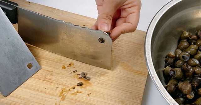 Chúng ta chỉ cần nhét đuôi ốc vào lỗ tròn, sau đó dùng con dao khác đập bỏ phần đuôi ốc lộ ra ngoài, sao cho đuôi ốc có thể dễ dàng lấy ra.