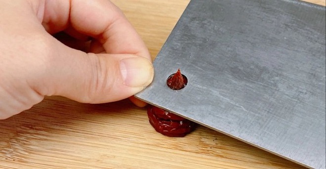 Trên thực tế, chúng ta có thể sử dụng lỗ tròn trên con dao để làm công việc này. Cách thực hiện rất đơn giản, bạn hãy đặt chà là đỏ lên thớt, sau đó ấn sâu phần đầu quả chui qua chiếc lỗ này. Tiếp theo, dùng tay lôi hạt chà là ra là hoàn thành.