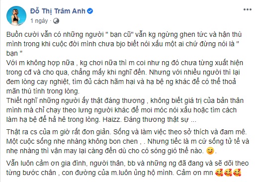 Trâm Anh cho biết bây giờ mình chỉ muốn một cuộc sống đơn giản không bon chen và tin rằng nếu cứ sống tử tế thì vận may sẽ tới. Bài đăng của nàng hot girl không chỉ đích danh ai nhưng cũng khiến cộng đồng mạng "dậy sóng". Bên cạnh những bình luận đoán già đoán non thì đa phần đều an ủi người đẹp đồng thời bày tỏ sự nể phục cách hot girl vượt qua những sóng gió, thị phi trong quá khứ.