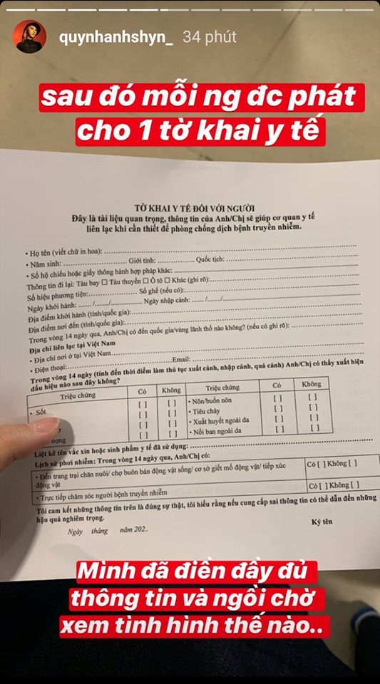 Theo chia sẻ của Quỳnh Anh Shyn, dù khá lo lắng và có lúc bật khóc nhưng cô nàng vẫn bình tĩnh chấp hành các quy định từ khai báo y tế, đeo khẩu trang và rửa tay thường xuyên, di chuyển theo hướng dẫn đến trạm y tế,...