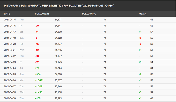 Và theo như số liệu thống kê từ trang Social Blade, Instagram của Du Uyên đã tăng ít nhất là 30.000 follower mới sau vài ngày lùm xùm. Trước ngày 24/4, Instagram của Du Uyên vẫn thường bị unfollow khoảng vài chục người, nhưng từ ngày 24/4, khi mà cô nàng đăng status ẩn ý chia tay thì Instagram liên tục tăng follower, có ngày tăng tới hơn 15K người.